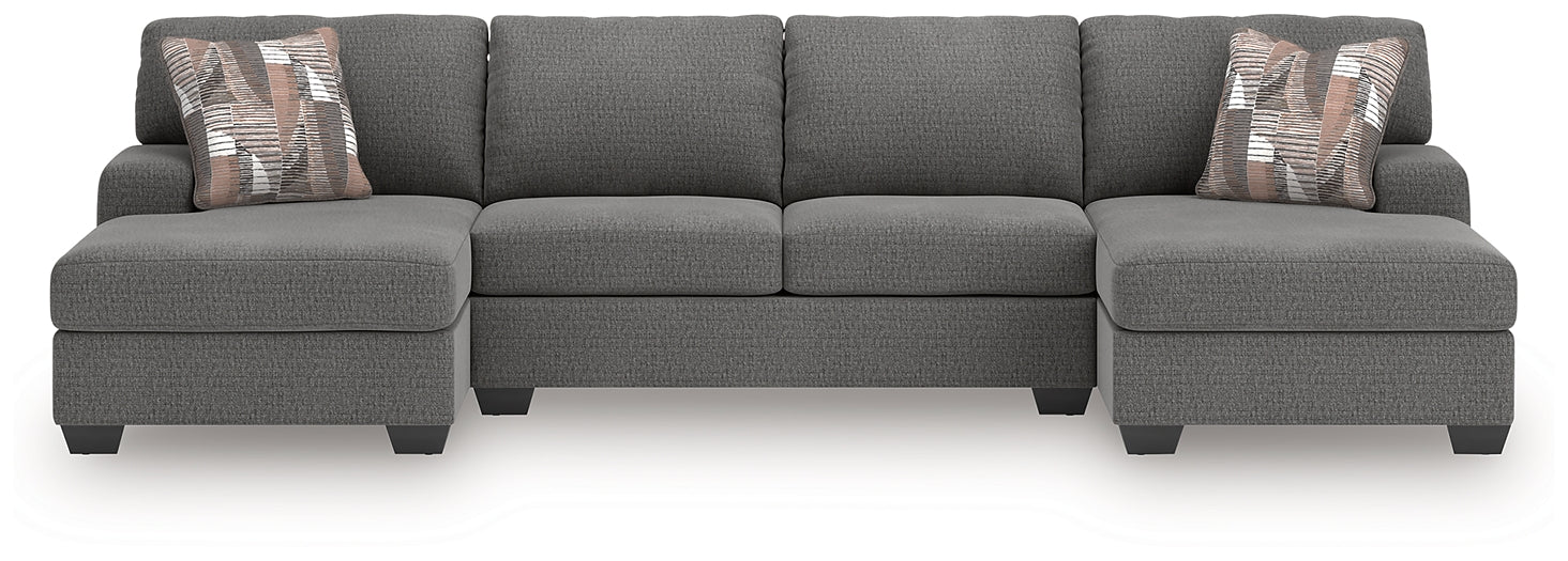 Details | Includes 3 pieces: left-arm facing corner chaise, armless loveseat and right-arm facing corner chaise, "Left-arm" and "right-arm" describe the position of the arm when you face the piece , Corner-blocked frame , Attached back and loose seat cushions, High-quality foam cushions wrapped in poly fiber, Accent pillows included, Pillows with soft polyfill, Polyester upholstery, Exposed feet with faux wood finish , Platform foundation system resists sagging 3x better than spring system after 20,000 testing cycles by providing more even support, Smooth platform foundation maintains tight, wrinkle-free look without dips or sags that can occur over time with sinuous spring foundations | |