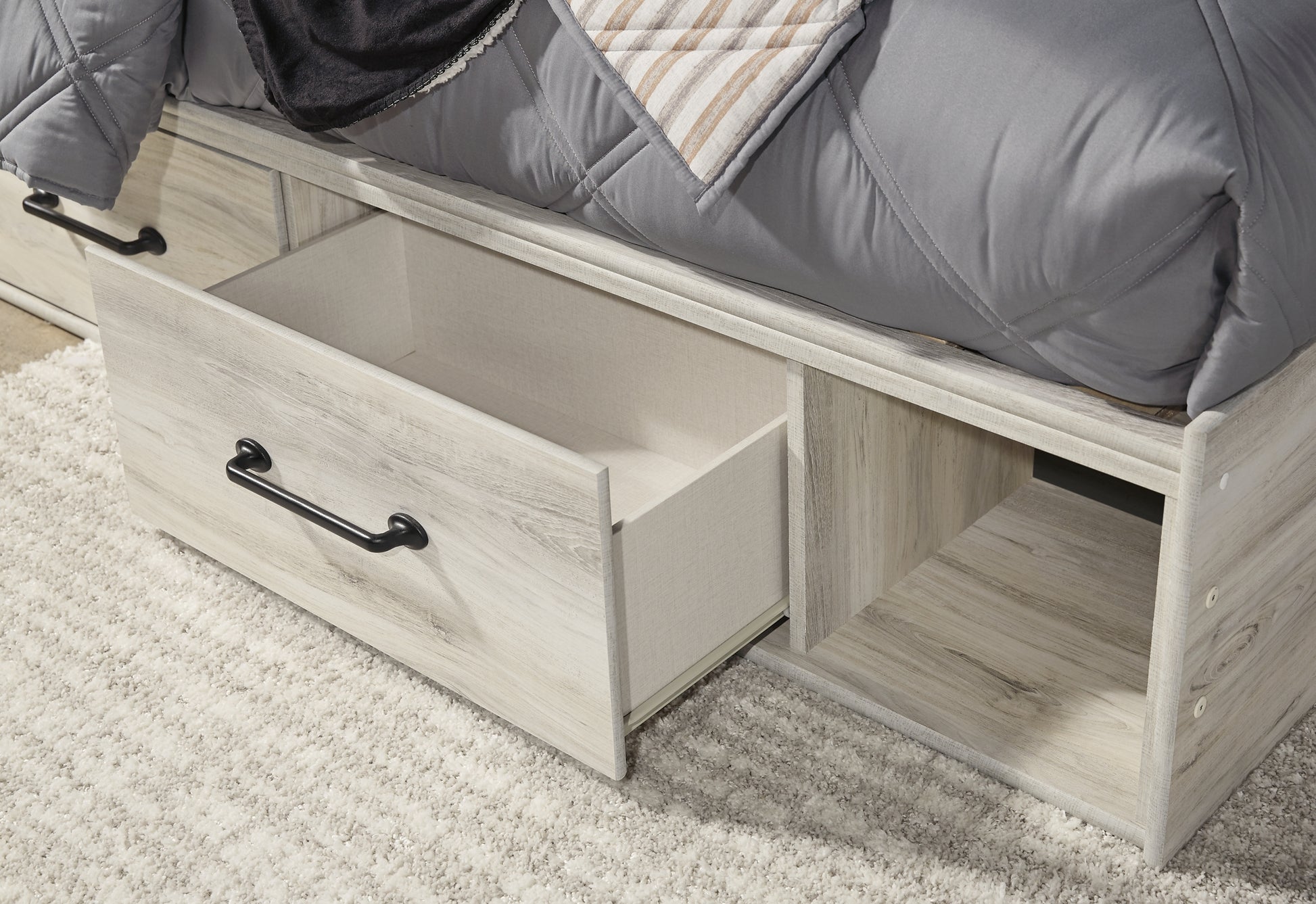| Details | B192-46: Made of engineered wood (MDF/particleboard) and decorative laminate, Wispy white finish over replicated oak grain with authentic touch, Large-scale hardware with dark finish, 5 smooth-gliding drawers, Drawer interiors are lined with a faux linen laminate for a clean, finished look, Safety is a top priority, clothing storage units are designed to meet the most current standard for stability, ASTM F 2057 (ASTM International), Drawers extend out to accommodate maximum access to drawer interior while maintaining safety, B192-92: Made of engineered wood (MDF/particleboard) and decorative laminate, Wispy white finish over replicated oak grain with authentic touch, Large-scale hardware with dark finish, 2 smooth-gliding drawers, Drawers lined with faux linen laminate for finished aesthetic, 2 slim-profile USB charging stations, Power cord included; UL Listed, B192B1: Includes dresser with mirror, Made of engineered wood (MDF/particleboard) and decorative laminate, Wispy white finish over replicated oak grain with authentic touch, 6 smooth-gliding drawers, Drawer interiors are lined with a faux linen laminate for a clean, finished look, Large-scale hardware with dark finish, Mirror attaches to back of dresser, Assembly required, B192B21: Includes headboard, footboard, side storage, rails and slats, Made of engineered wood (MDF/particleboard) and decorative laminate, Wispy white finish over replicated oak grain with authentic touch, Large-scale hardware with dark finish, Decorative sconce light, LED with 3 AA batteries, 4 smooth-gliding storage drawers, 4 storage cubbies, 2 slim-profile USB charging ports, Power cord included; UL-listed, Bed does not require additional foundation/box spring; accommodates most zero clearance adjustable bases with the addition of a bunkie board, Mattress available, sold separately, Assembly required, | |
